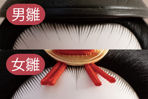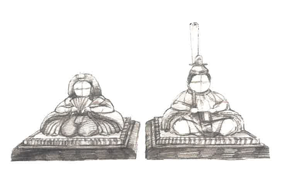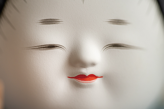 男雛は、長い線を一本、短い線を三本、額を中心に左右対称になるよう均等に書き入れ力強さと優しさを表現しています。女雛は、古くから美しい女性の額の特徴としていわれる富士額になるよう書きます。 一本一本の線が明確でミスが許されない、石川潤平作品の特徴的な書き方です。