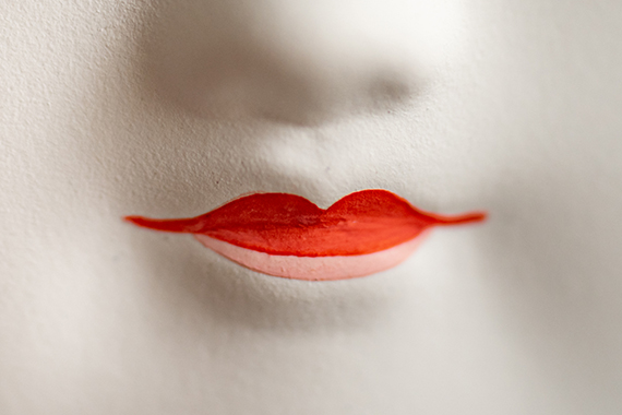 上唇は富士山の裾のようになだらかに左右均等に流し、下唇は二重に口地を描き奥行と柔らかさを表現します。それぞれ微妙な色の濃淡を加減することで立体感が出てより表情を豊かにします。筆先の圧や速度を巧みに操る事の出来る石川潤平の筆仕事が見てとれます。