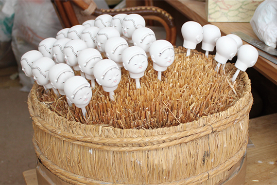 約800℃で熱し、石のように硬くすることで、キズやへこみの入りにくい耐久性のいい頭になります。生地を窯に入れて焼き固め、丁寧に磨きをかけたのち胡粉を塗り重ね仕上げます。一般的な石こうの頭に比べ手間と時間がかかりますが、その分頑丈な頭に仕上がります。